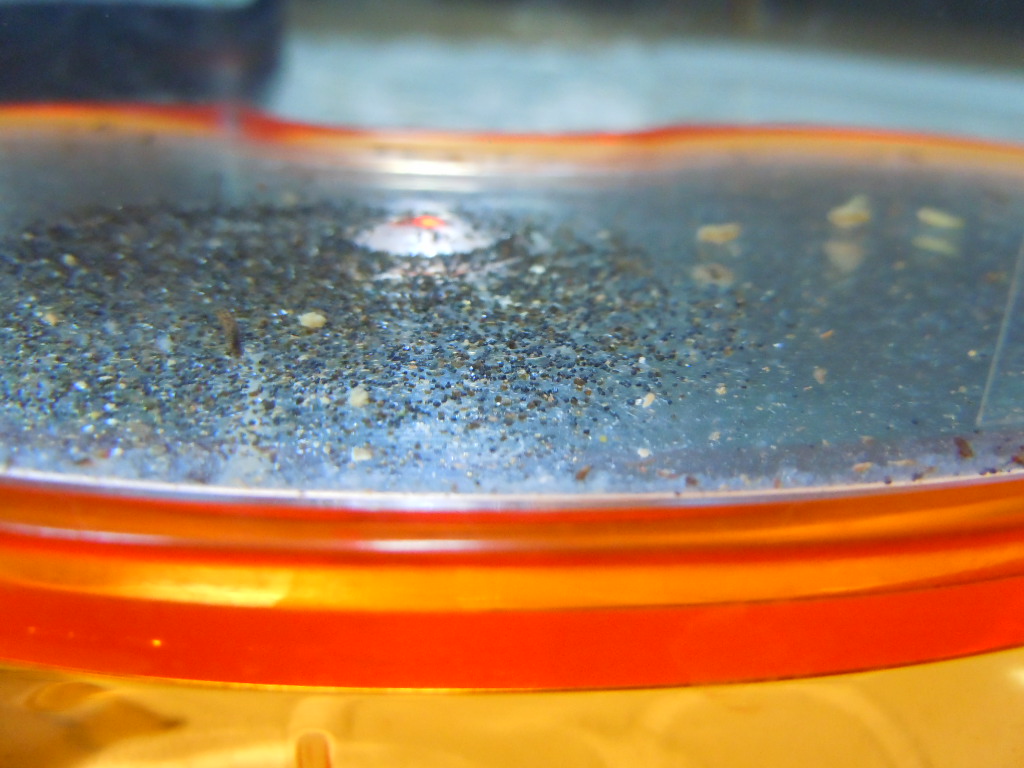 誕生!うひょ! ひょっとして… ライトを当て目を凝らしてみました(凝視) 孵化していました(感激!) ん? んん? もう一匹います。 しばらく見ているとなんと… なんともう一匹いるではないですか!! 合計3匹孵化していました。 もう感激です。 写真の中に写ってはいるのですがあまりにもちぃっちゃすぎて… 一生懸命動いています。 問題はこれがカブトエビかということです(^^) まぁ〜とにかく大切に育てなければ! 豊年エビでないことを祈って(^^) 水槽もう一個買わなくては! 説明書に共食いすると書いてありました。 しかし見れば見るほどかわいいもんです(馬鹿) しばらく時の経つのも忘れ見入っていました…。 その日は会社に遅刻しました(ばかたれ〜) |