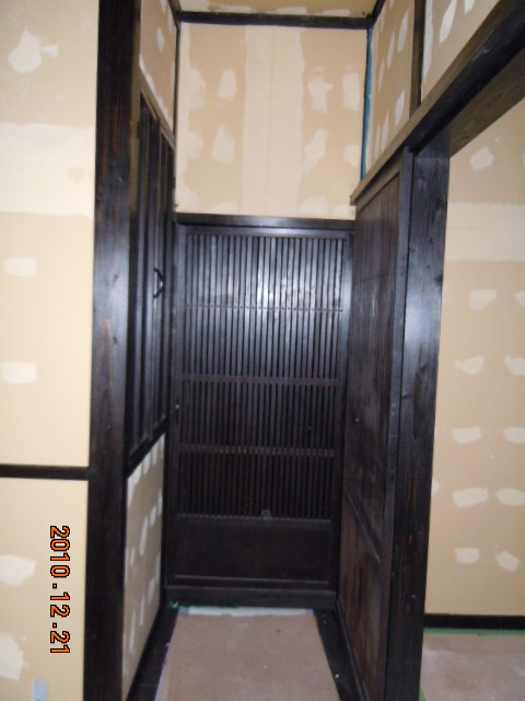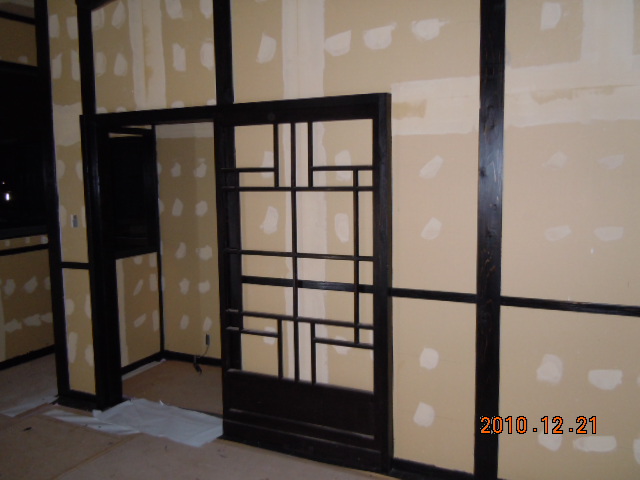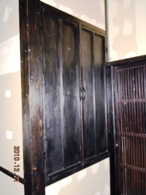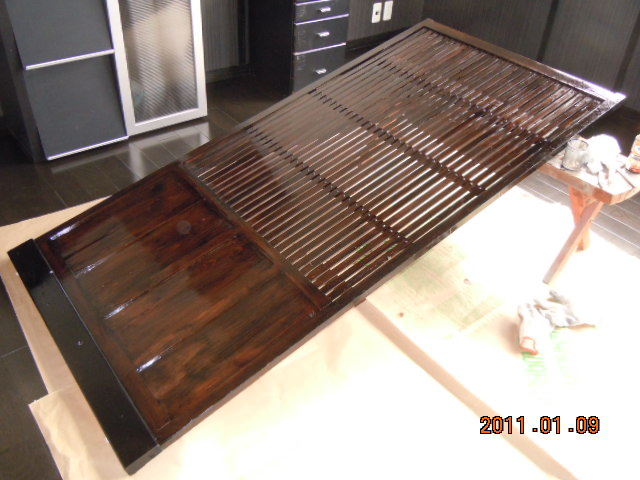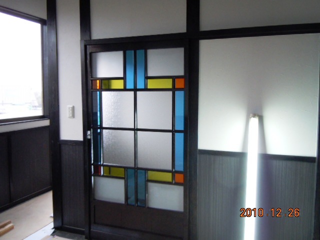 建具に挑みます(^^)今度は建具工事です(気合い!) 「古民家風+洋風レトロ」をテーマにしております(笑) 建具は古民家で使用されていた本物です。 熊本の材木店で、そこの専務が古民家が好きで取り扱っていたものを安く譲っていただきました。 しかし、そのままでは使えません。 長年の汚れが染みついております。 洗い落とすわけですが、あまり神経質になってしまうと古さの良さがなくなってしまいます。 そこの加減が難しいですね。 また、すすけていますのでちょっと艶を出したいわけですね(色気) 水性ニスやオイルステンを塗ってみました…。 どれも今一つです(涙) 最後に油性ウレタンニス(ブラック)で挑戦です(気合い!) 失敗したらどうしようとビビりながら… 結果はイメージ通り(ヤッホー) 入り口用に買った建具はガラスが割れていました。 それをリフォームするわけですが… まずは洋風レトロに(なんのこっちゃ!) 写真の通りです。 ステンドガラス風にしてみました。 物入れの建具(扉)は全部自分で作ってみました。 なんとなくイメージに近づいてきたかな〜と… 次にこだわったのは照明ですね(楽しみ!) |