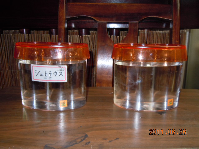 準備に…この梅雨の時期なんです。 田植えが終わるころ… そうです! シュトラウス3世(カブトエビ)の準備に取り掛かる時期が!! 昨年はふ化に成功しました。 しかし、暑さ対策と酸欠対策に失敗してしまい昇天させてしまいました。 今年の目標は卵を産ませるまでです。 その卵を来年ふ化させたいと思っております。 なんて壮大な企画なんでしょう(笑) とても47祭の大人が… 準備としましては水道水のままではだめです。 一晩おいてカルキを抜かなければなりません。 写真のように一晩置きます。 今年は水槽も2個用意しました。 頼むぞ! シュトラウス3世!! |