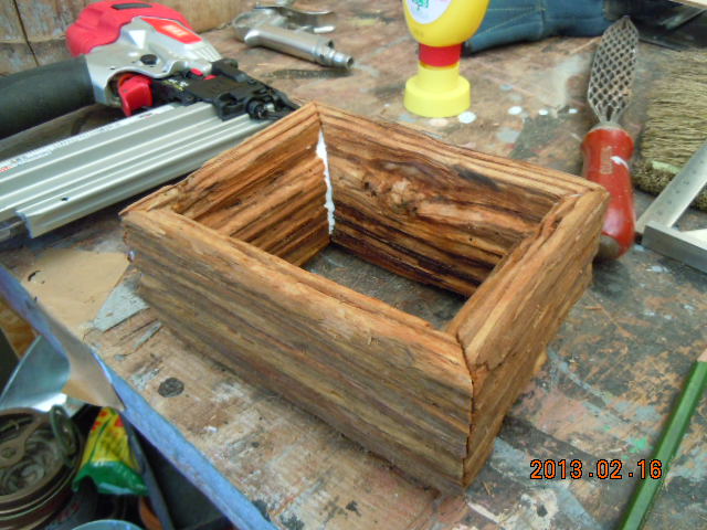 作成中…工房での作業もつらくないかなと(^^♪ 床はコンクリートです 寒い日はほなこつ寒かとです(@_@。 あんまり寒いと手がかじかんでケガします 以前、鼻水たらしながらやっていたら彫刻刀がすべり指先を切ってしまいました 血がどくどくでました(・_・;) それ以来、冬はあまり製作はしません でも我が家のしだれ梅も満開です! 春がやってきています(^o^) 今日は時間があったのでなんか作ってみようかなと… 流木を眺めながらイメージをふくらせます ん…これをあ〜して、これをこ〜してなどイメージすっとです(._.) なるべく素材はそのままにがモットーです 今回は小物入れにしました ざっと作っているように見えますが… じつは意外と緻密です(゜-゜) 電気のこぎりで角度を45度に切りそろえます その際、切っては合わせの繰り返しです 1mm単位で合わせていきます 最後はやすりで削り合わせます 時間がかかっとです… でも、それが楽しかとです(^_^)/~ ボンドで張り合わせます ボンドは木工用です 乾けば透明になります 乾くまで時間がかかります 今日はここまで! 続きは来週で〜す(^O^)/ |