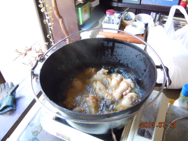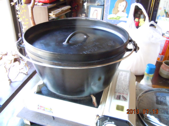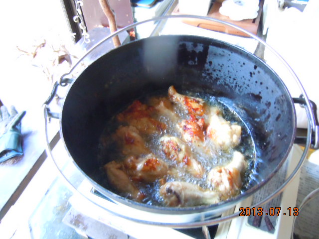 プチアウトドア!(^^)!ほなこつ、まうごつあち〜とです(-_-;) 訳:本当に、死ぬほど暑いです… そんな中、世の中は三連休です(^o^) かといってこの暑さ! とてもアウトドアをしようとは… 私は家で暇こいていました そういえば女房が朝から言ってたな… 「夕ご飯はから揚げだよ」 「いっぱい揚げるから手伝ってよ」 この暑いのにから揚げ? 聞くと母が買い物に行った際、安かったのでいっぱい買ってきたとのこと 母も余計なことを…(-_-メ) まぁ〜時間はあるし一肌脱ぐか(^^♪ 万能調理器具の登場です! その名は「ダッジオーブン!」 煮る、焼く、蒸す、揚げる、はては燻製までできる優れものです(^_^)v 元はカウボーイが野外で使っていたそうです それがアウトドア用品になったちゅうわけです キャンパーは必ず欲しくなるものです! そしてチキンの丸焼きをチャレンジするんです!! いろんなメーカーから出ていますが私はユニフレームを使っています このメーカーのステンレス加工技術は素晴らしいです 密閉性が優れています 通常は炭火を使用するのですが今回はカセットコンロを使います 油はチキンが半分くらい浸かるくらいで十分です 油が温まったらチキンを放り込みます そしてふたをするんです このふたをするのがポイントです ふたは厚さが5ミリくらいあり重量があります 密閉性がいいので簡単に言えば「圧力鍋状態」ですな… これでなんでも美味しくできるんです(^^♪ 蒸気がシュポシュポ出てきたら中を確認です よか色に揚がっています ここでチキンをひっくり返します ついでにビールのふたも開けます(プシュ!) ぐびぐびと… 「うまい!」やめられんとです(^_^)v ふたをして待つこと3分… 蒸気がシュポシュポと… できあがりです♪ すぐにアジ塩をふるのがポイントです 夏はちょっと塩気を多めに! さぁ〜2回目に挑戦!! ビールも2本目に突入<(`^´)> 揚げたてをつまみにビールが進みます(゜-゜) できあがるのはどちらが先かな? から揚げ? それともわ、た、し、?? |