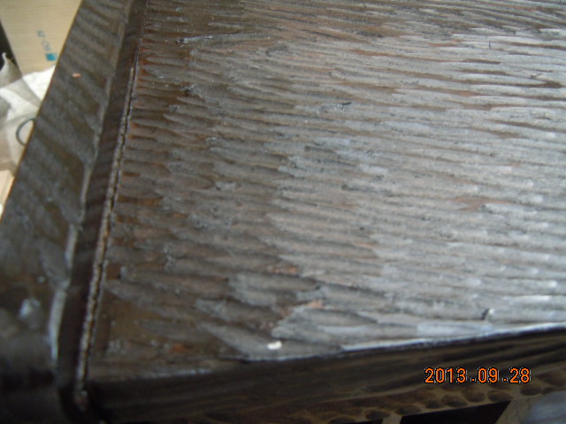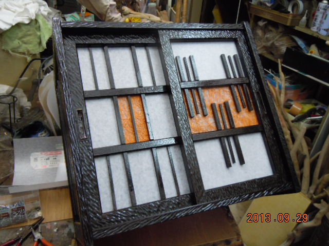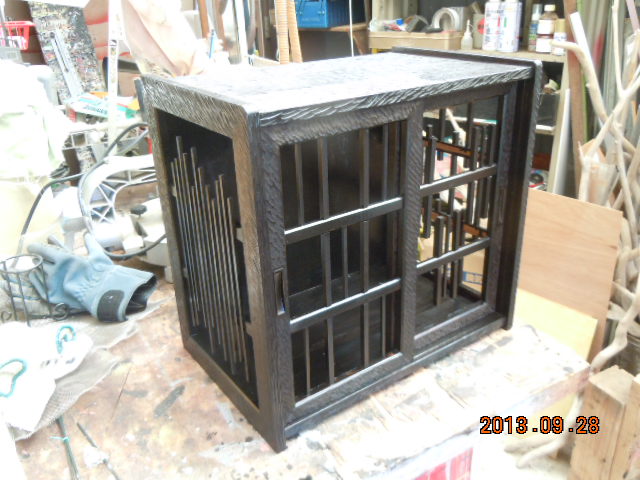 湯のみ入れの再生…その4こんな日は塗装作業に限ります! 気温は高く、湿度は低い! 一気に塗り上げます<`〜´> 色はオイルステインのマホガニです 写真では黒に見えますが黒じゃなかとです こげ茶をさらに濃くしたような感じです 私が好きな色です(^_^)v オイルステインの良いところは渇きが早く、浸透性が強いところです ちゃんと2回塗ります 1回ではいかんとです 色に深みがでません 手をぬかず2回塗れば仕上がりが違います 仕上げにニスを塗ります まぁ〜艶出しですね 彫刻刀でひたすら掘りまくりましたがこんな感じです 以前の物とは別物になりました(^^♪ 今日は時間があったので扉を仕上げてみました 裏から障子を挟んだプラスチックの板を張ります 面白い和紙があったのでちょっとワンポイントを入れてみました 白一色でもよかったのですが… 私は凝ったものが好きとです(゜-゜) あとは側面を仕上げて棚をつければ終わりです それは次回に… 女房はこれをみてなんて言うかな(._.)… |