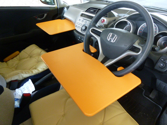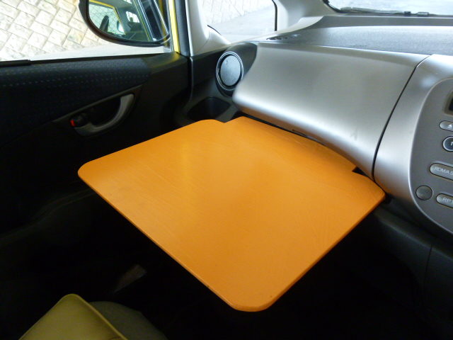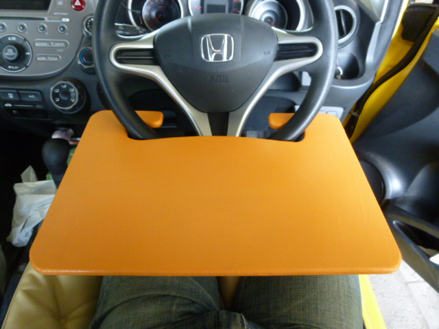 こんな使い方です〜♪正解はこれだったんですね〜♪ ハンドルにひっかけて使う「簡易テーブル」でした(^_^)v 車の中で食事をするのは意外と大変なんです… 何故かと申しますと、平らな場所がないからです! カップホルダーは大体ついています でも弁当等を広げられるペースがなかとです…(・_・;) 商用車は助手席を倒して、そのスペースに使えるのもあるみたいですが… うちは「フィット」です… このへん、メーカーも考えてみてはいかがでしょうか? 今回、助手席用も作ってみました<`〜´> これも差し込むだけです 外れないようにちょっと工夫してあるとです(ちょっと自慢) 弁当食っているときに外れたら大変ですもんね 普段、こんなことばっかり考えてます(笑い) でも、ちゃんと仕事はしてますよ(・_・;) この道具でますます行動範囲が広がりました 天気が良い時は外で食事をします 天気が悪い日、寒い日は車の中で食べるとです 味噌汁も置けます(゜-゜) 女房にお披露目しました あきれていました… 「休みの日にこんなの作ってたの…」 後日、女房が昼休みに使ってみたそうです 女房曰く、「あんたが今まで作ってきた中でこれはヒットよ」と… 特に「助手席のが使いやすい」と 一緒になって25年、初めて褒められたような気がします(T_T) うれしかとです(^O^)/ これからもせっせと名作(迷作?)を作ろうと誓った私でした… 午後からは女房の車(フィット)を洗ってあげました♪ ひょっとして、女房の手の平の上か? |