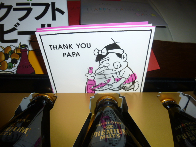 幸せ者…ママがまた通販で何か買ったんかな? ネットで買い物をするのがストレス発散みたいで(゜-゜) そのまま風呂に入りまして♨ リビングに戻るとママから「あなたに荷物が届いてるよ」と… あの荷物は俺のか♪ 送り状を見てみると娘からです(?_?) ん? 持ってみると重たい… 包装を開けてみますと 「SUNTORY PREMIUM MALTS」 の箱が(りっぱな化粧箱です)♪ 箱を開けるとメッセージカードが… そっか! 父の日か!! カードを読むと「感謝」の文字が… 号泣です(T_T) 私はどちらかといえば仕事人間で娘たちにはあまりかまっていません そんな父親なのに感謝されてるなんて… こちらが感謝したいくらいです 仕送りは生活費くらいの必要最小限度です 自分たちでバイトをし、そのなかから買ってくれたんでしょう(T_T) 以前、CMで放映されていた時に「こんな最高のビールを飲んでみたいな」 私がボソっといった言葉を娘たちが覚えていたんですね 気の利く娘たちです おまけにおつまみまで入ってました もったいなくて食べれません 取りあえずビールは一本だけママにあげました いや〜最高に美味いビールでした(^^♪ 悪いけどママにはこれ以上あげません 私が大切に飲ませて頂きます ママは金麦でよかでしょ つまみも隠しておかなければ(・_・;) ママのお腹に入ってしまう… 私は幸せ者です♪ 父としての喜びを噛みしめた一日となりました 娘たちよ! これからもよろしくな(^_^)/~ |