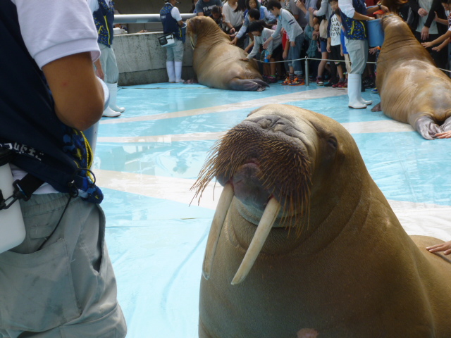 家族旅行(大分編)…うみたまご編現地に到着したらママのわがままが始まりました(-_-;) 私、以前来たことがあるから入らないと… 近くのカフェで時間をつぶすからなんて言い始めました(ちょっと怒り) ここは家族旅行だし、せっかく来たのだからとなだめすかし入場することに… ええ年こいて本当に手の焼ける人です(@_@。 入ってみれば私個人的にはおもしろかったですね♪ 大好きなペンギンの寝顔も見れましたし… 写真では目がひらいているように見えます でも、小さな黒い点はまぶたです よく見るとその下に目を閉じた状態になっています 水槽を見るに時には釣りをする時をイメージします そうか… この魚はこんな場所にいるのかとかですね(笑) びっくりしたのがごまアザラシです なんと人間みたいに横になって寝るのです(@_@。 写真を見てください! 皆、横になっていますでしょう ちょっと笑いました(^_^) また、子供が遊べる広場ではカメレオンが放し飼いに… 監視員がそばにいるとはいえ子供たちがいたずらしないのかな(?_?) しばらく眺めていましたがそんな子供はいませんでした(ちょっと感心) 今回、私が一番見たかったのは「ダイオウグソクムシ」で〜す♪ 深海に住んでいて餌も食べずに何年も生きている不思議な生物です 赤いダンゴ虫(写真参照)みたいなやつです 深海の生物なのでライトを当てることができないのでしょう 影響のない赤外線みたいなライトを当ててありました なおさら不気味です 思ったよりも大きかったです(゜-゜) 30cmくらいありました 実際、いきなりあんな大きな虫が現れたら気絶しますね(@_@。 セイウチのショーを見ることができました♪ いろんな芸を仕込まれていまして犬より賢いと思います ママが喜ぶことといったら(^_^)/~ ショーが終わったらそのセイウチにさわってくださいと… とにかくデカいし、もし暴れたら間違いなく即死です! 私はビビッて遠慮してるとママが走って行きます セイウチ目指して! え〜(@_@。 あのママが?? なんと子供たちに混ざってなぜています… 犬を触るみたいに… 笑ながら… うそだろ…怖くないのか? 男として黙ってみている訳にはいきません 私もさわってきましたよ<(`^´)> なんか昔家で飼っていたダックスが水遊びしたあとみたいな感じ(・_・;) なんじゃかんじゃで結構楽しみました でも、一番楽しんでいたのはママでした♪ 子どもたちよりもはしゃいでいましたよ(・_・;) 本当に手のかかる人です… |