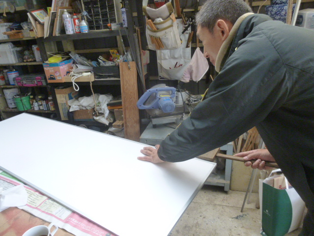 ママの手伝い…第2弾前回、職場で「美化委員」になったことを紹介しました その時は看板をリフォームしてほしいと… せっせと命じられるままリフォームしました(^^♪ 今回は新しく作りたいと…(゜-゜) イメージを聞いてみるとちゃんとした看板ですな… ホワイトボードにアルミの枠を回して文字を立体的に見せたいと… ちゃちゃっと色塗って終わりちゅうわけにはいかない代物です(汗) まぁ〜なんでも言う方は簡単に言いますもんね…(-_-メ) しか〜し、できませんとは言えない性格です 父が看板屋を営んでいたおかげで少しの材料が残っています その残っている材料で作るんです アルミの枠を四方に回すのです 角は45度に切って合わせなければいきませ〜ん それをボードにはめ込んでいきます 外れないように両面テープを貼り、角は金具で補強します なんとかボードはできました♪ 次は文字の切り抜きです 色つきのボードに文字を書き切り抜くのです 文字だけはママがパソコンで作りました(^o^) それをカーボン紙でボードに写しこみます 電動イトノコギリで切り込みます 地道な作業です とにかく肩に力が入らないようにするのがポイントです ついつい力んでしまいます(;一_一) そうするとまっすぐいかないし、カーブが丸く切れません 最初は緊張してなかなかうまくいかない… でも途中から要領を、思い出してすいすいと(^^♪ 切った文字を並べてみます まぁ、こんなもんだろ<`〜´> それをボードに貼り付けます ボードを字割してバランスを見ます なかなかのもんでしょう(^^♪ ママが帰ってくるなり看板を見つけました ニコニコ笑っています 「字体と大きさがいいよね」 「よくできてるわ」 字体と大きさ? そこだけ?? たしかにそこはママがしたところですもんね… いいか(・_・;) これで美化委員の面子は保てたでしょう♪ つぎはどんな依頼がくるのやら…(^_^)v |